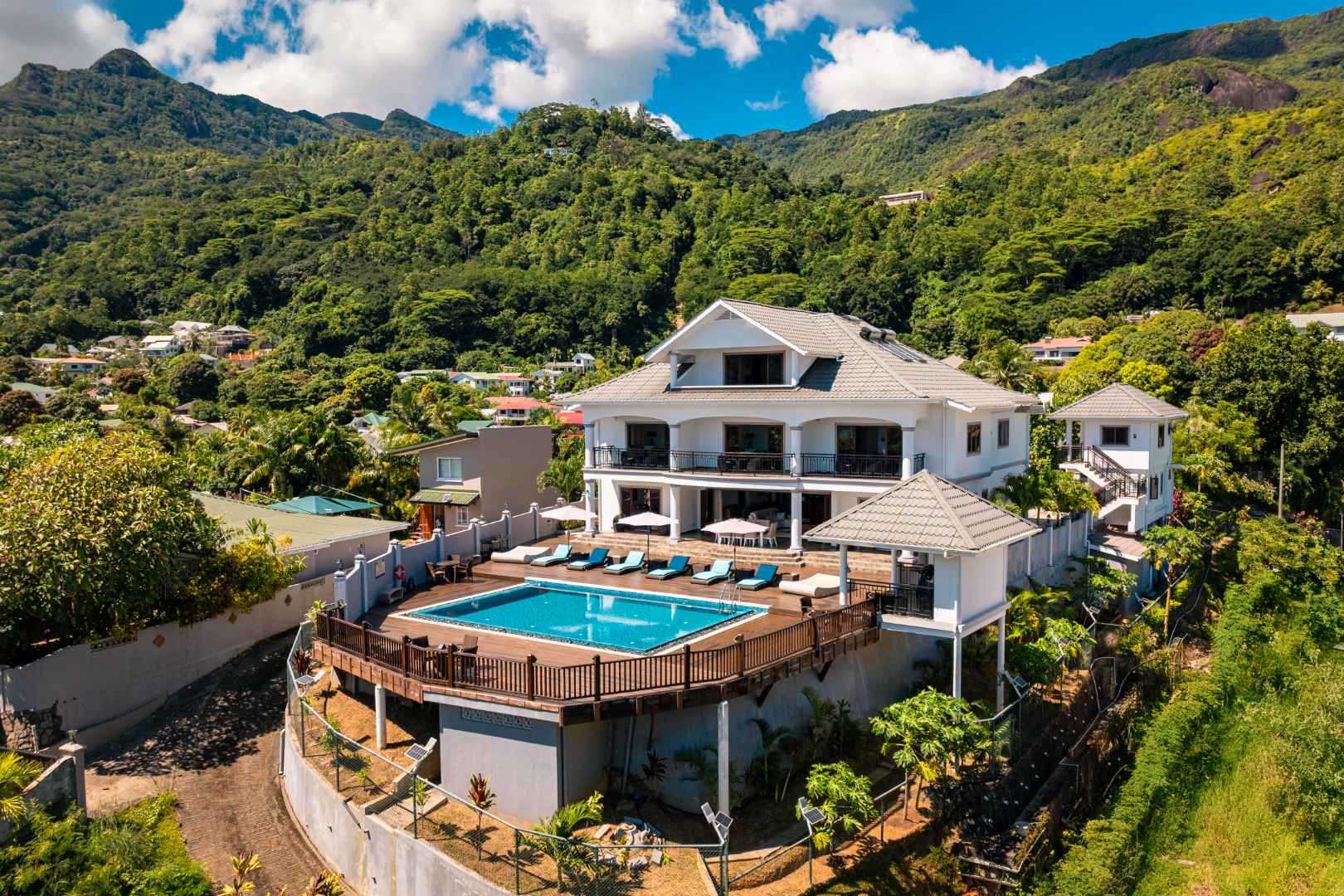 Exceptional villa located in sought Beau Bel Estate Bel Ombre, in North Mahe. Only 2 minutes from Beau Vallon Beach. Consisting of two dwellings. The double storey residence consists of 2 sumptuous en-suite bedrooms, kitchen, main living and dining room with guest WC and storeroom on the ground level, with a further 2 en-suite bedrooms, a second kitchen and dining area, WC and study on the upper level. Large outside patio complete with swimming pool, bar and changing area. The basement consists of another guest WC, shower, laundry and storeroom with water storage capacity of 36 000 litres and diesel generator. The second dwelling includes a fully self contained one bedroom suite on the ground floor and deluxe studio with separate entrance on the upper level. Truly a remarkable residence.