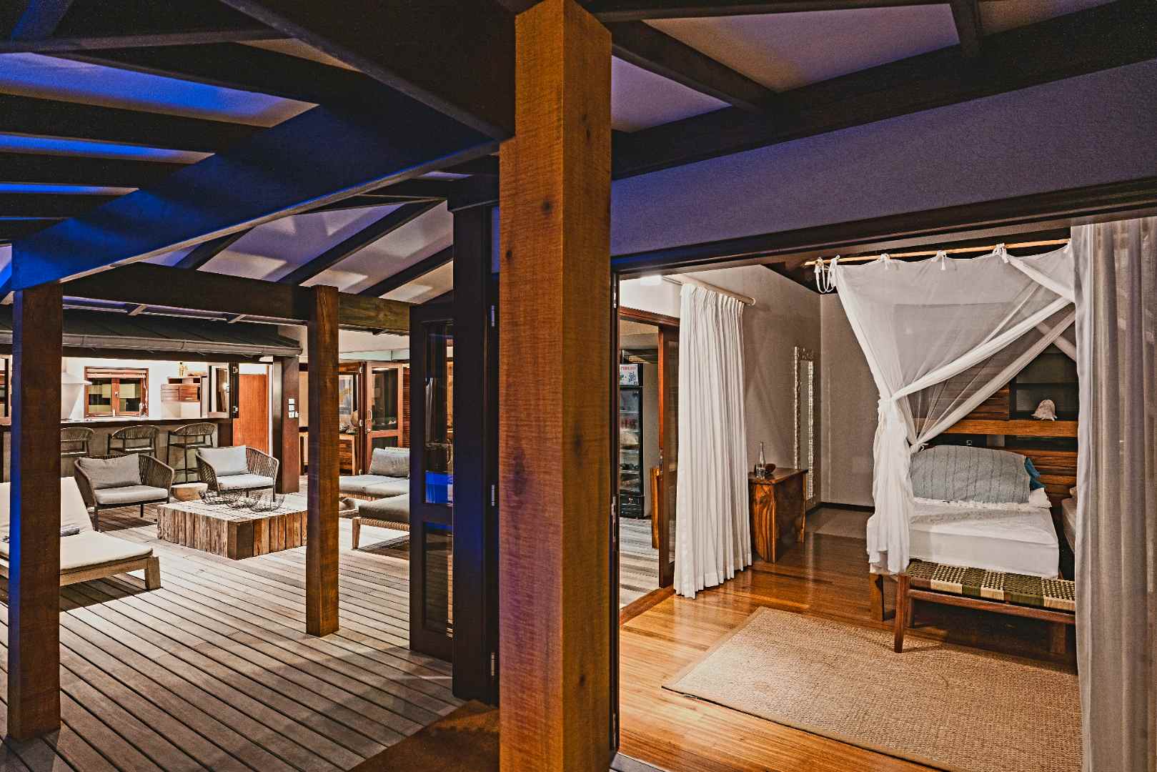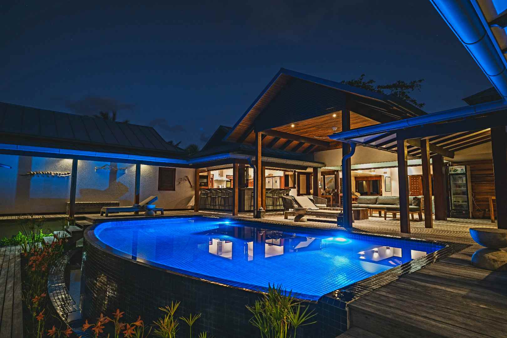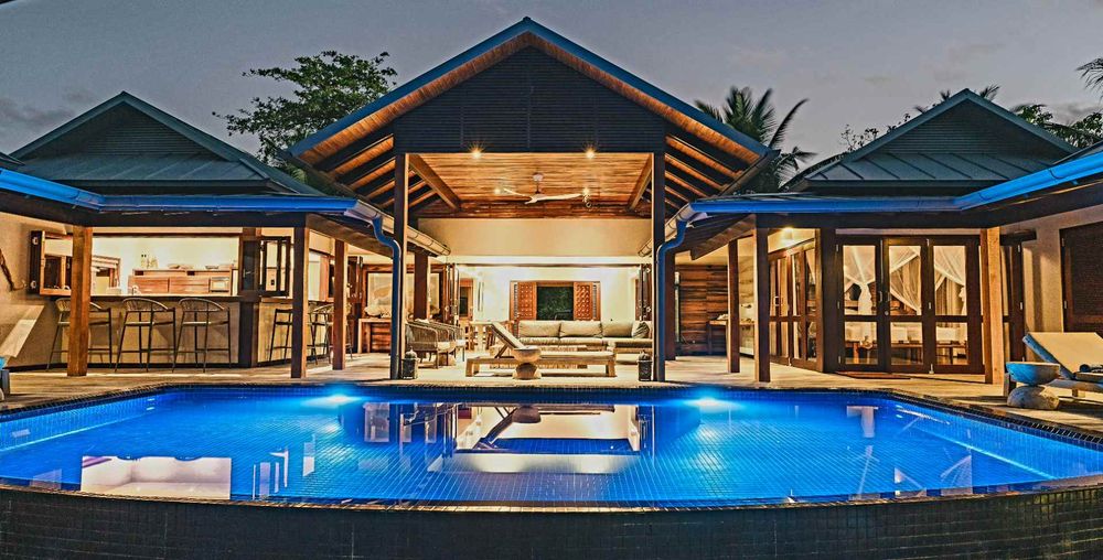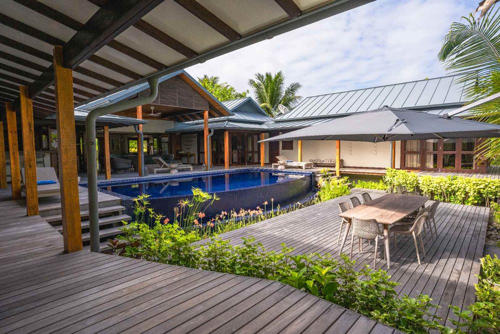 Exceptional beachfront villa, on the magical and private Desroches island. Set on a large parcel of land extending over 2500m2 with over 440m2 of living space under roof. Set on only a single storey, designed in the vernacular Seychelles architectural style, with a concerted focus on understated luxury, lifestyle and entertaining. Offering 4 sumptuous outsized en-suite bedrooms with king beds, free-standing bathtubs, indoor and outdoor showers, double vanities, and breathtaking views of the lush tropical gardens and ocean beyond.
