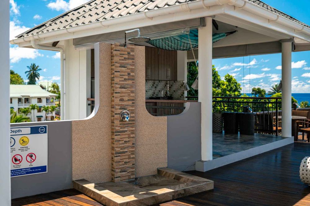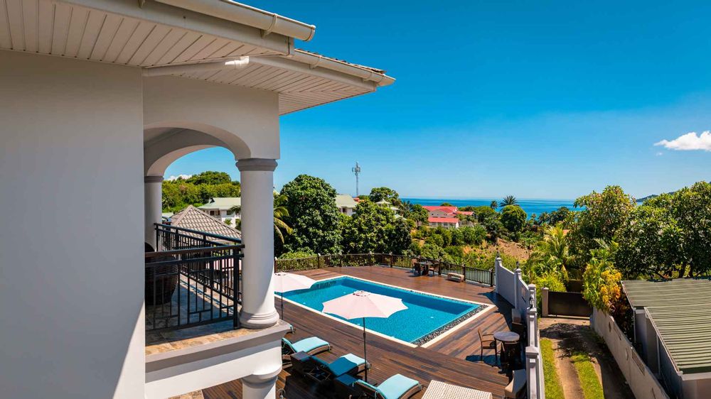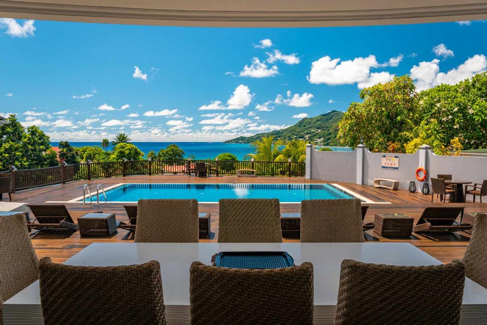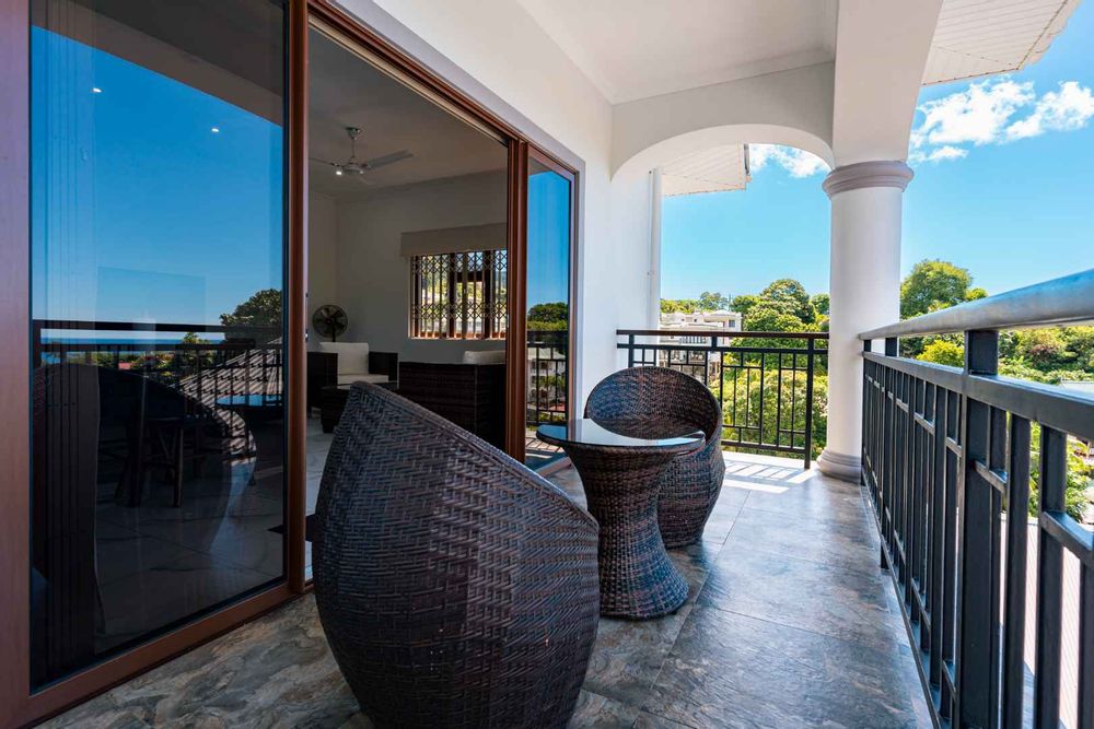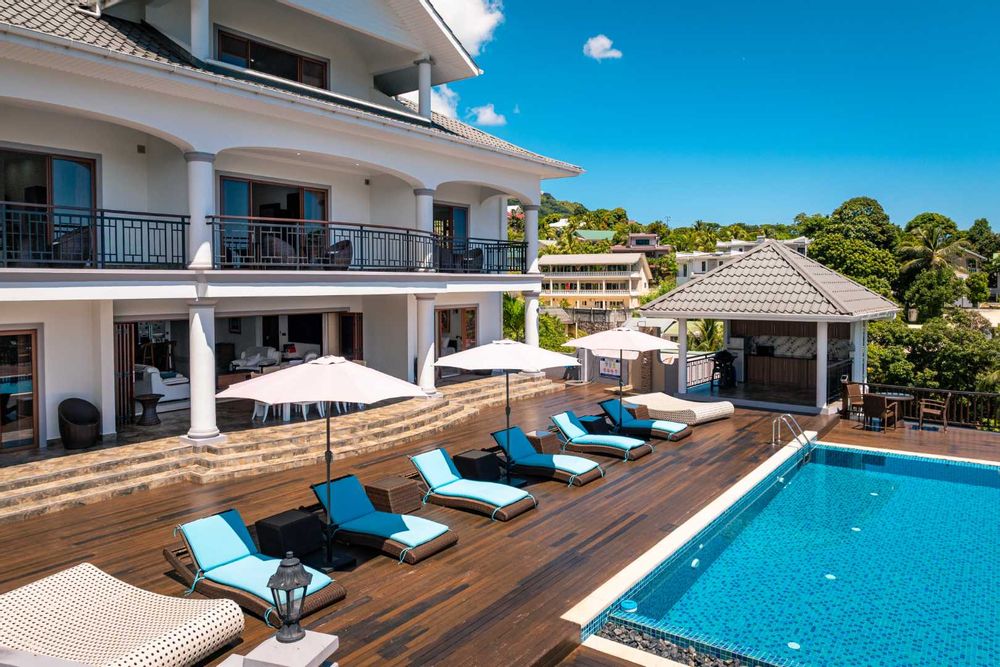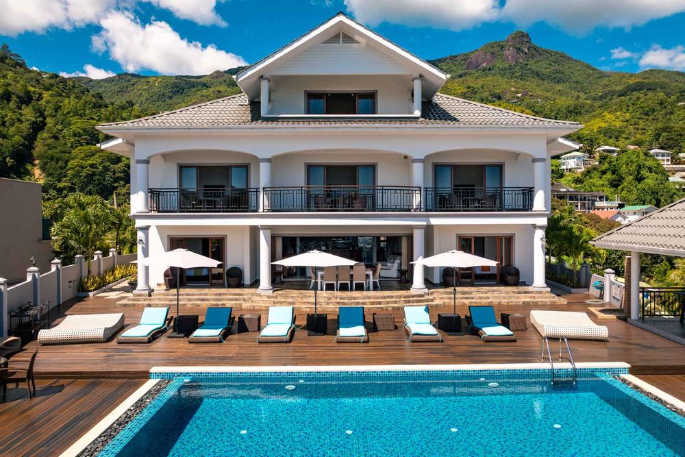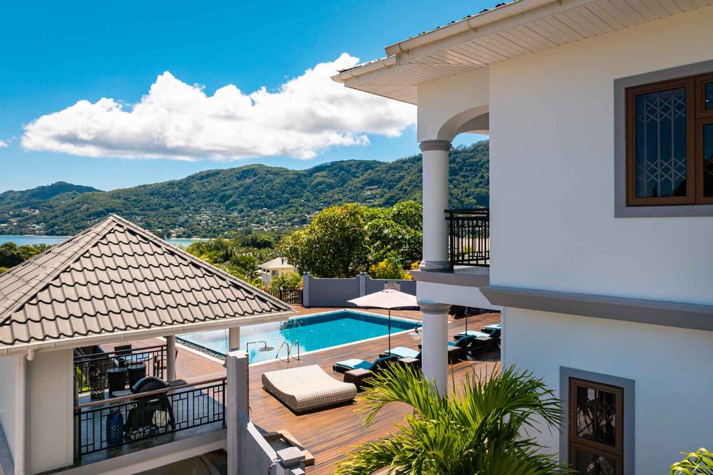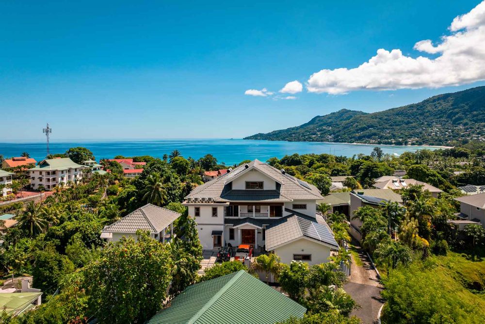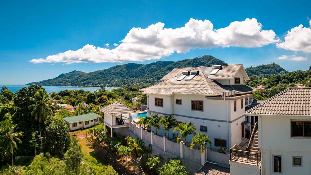 Exceptional villa located in sought Beau Bel Estate Bel Ombre, in North Mahe. Only 2 minutes from Beau Vallon Beach. Consisting of two dwellings. The double storey residence consists of 2 sumptuous en-suite bedrooms, kitchen, main living and dining room with guest WC and storeroom on the ground level, with a further 2 en-suite bedrooms, a second kitchen and dining area, WC and study on the upper level. Large outside patio complete with swimming pool, bar and changing area. The basement consists of another guest WC, shower, laundry and storeroom with water storage capacity of 36 000 litres and diesel generator. The second dwelling includes a fully self contained one bedroom suite on the ground floor and deluxe studio with separate entrance on the upper level. Truly a remarkable residence.