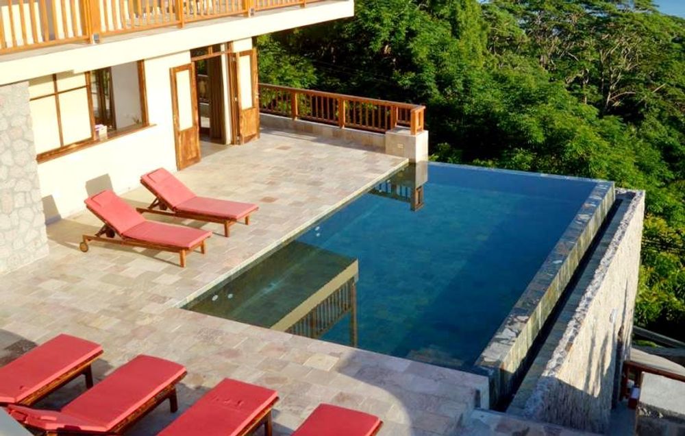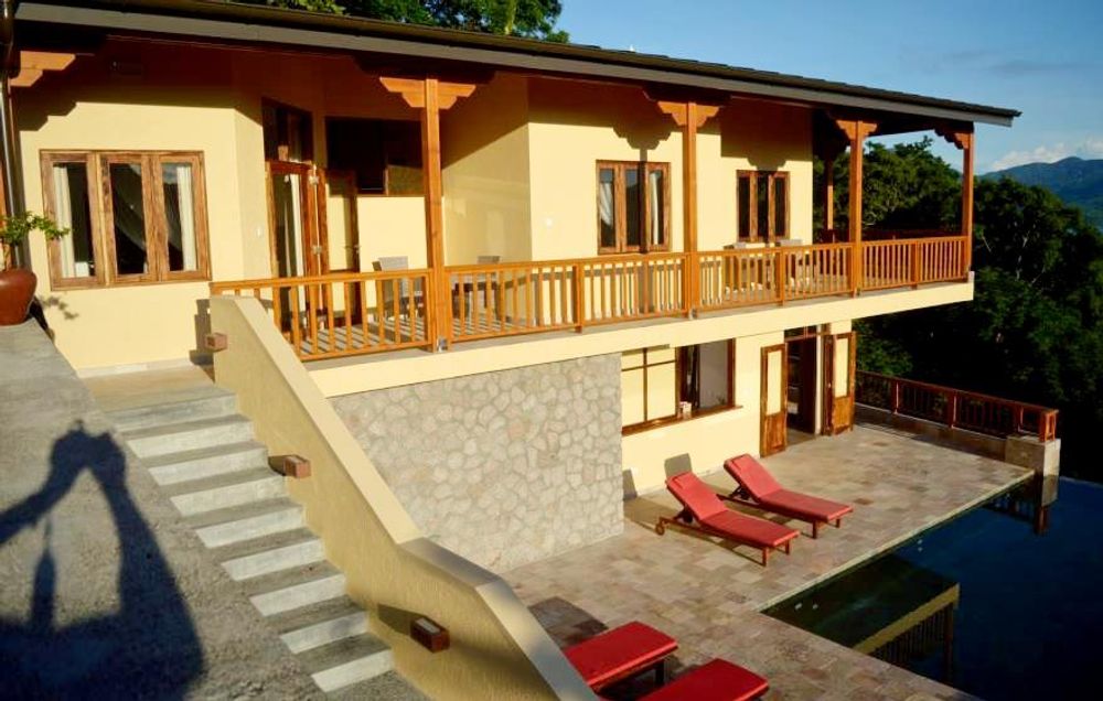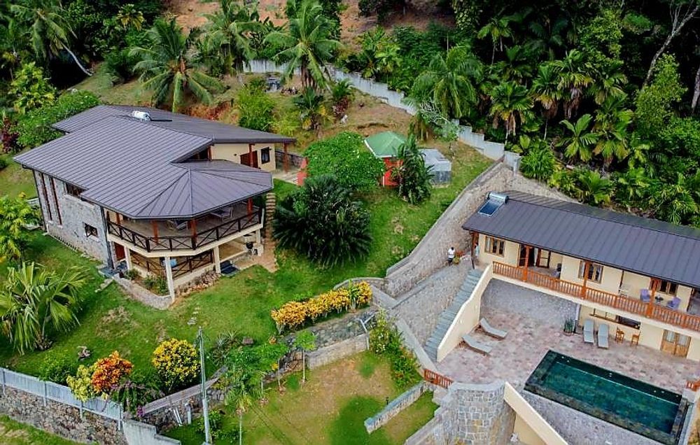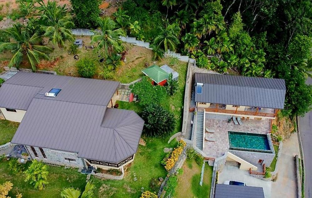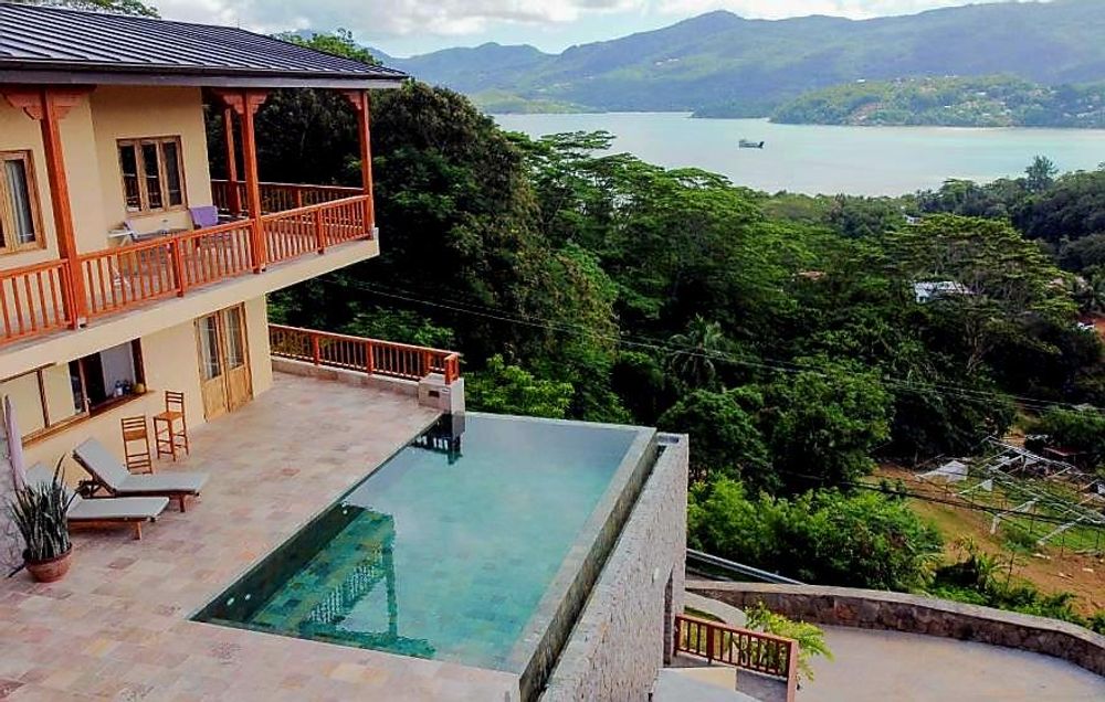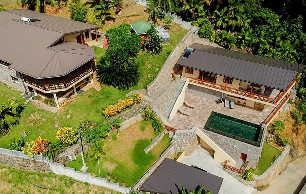 Exceptional small scale tourism opportunity and private residence. Located in the South West of Mahe, with incredible views over Baie Anse La Mouche. The property consists of 2 main buildings. The main house offers 4 bedrooms and 2 bathrooms with a large front terrace and built to European specifications and standards. The second building offers to separate apartments with private access, one above one another. The lower apartment offers one large bedroom with direct pool terrace access. The upper apartment offers 2 bedrooms and 2 bathrooms and has a private terrace. Large infinity pool overlooking the bay and separate bed sitter and laundry complete this remarkable property. Conveniently located with easy access to Anse Soleil, the Four Seasons and Kempinski Seychelles Resorts.