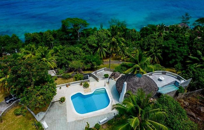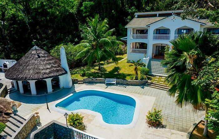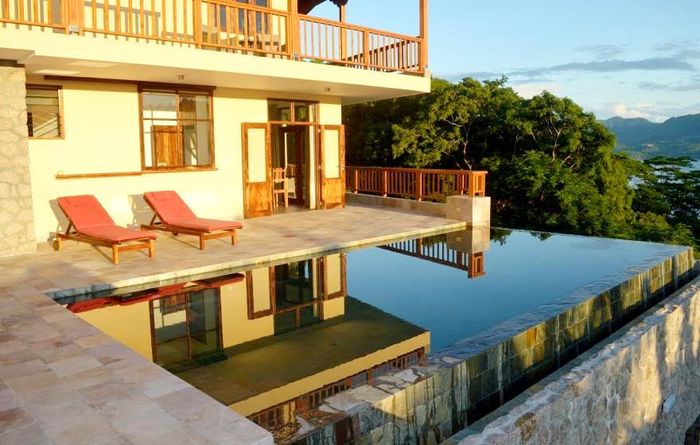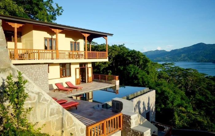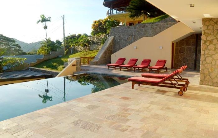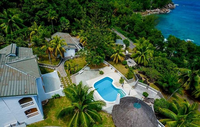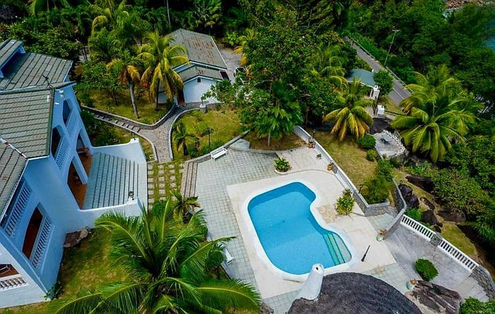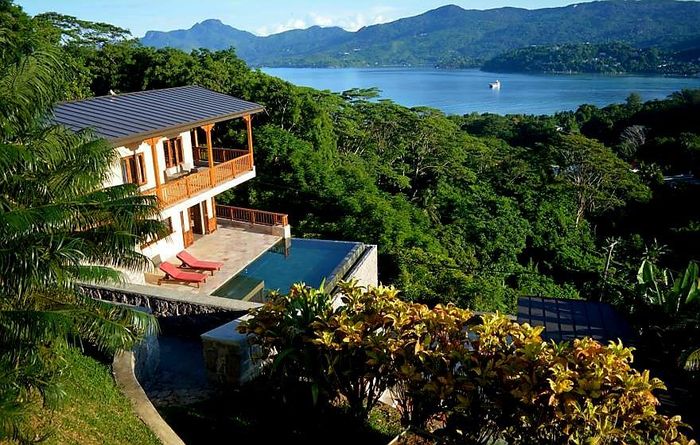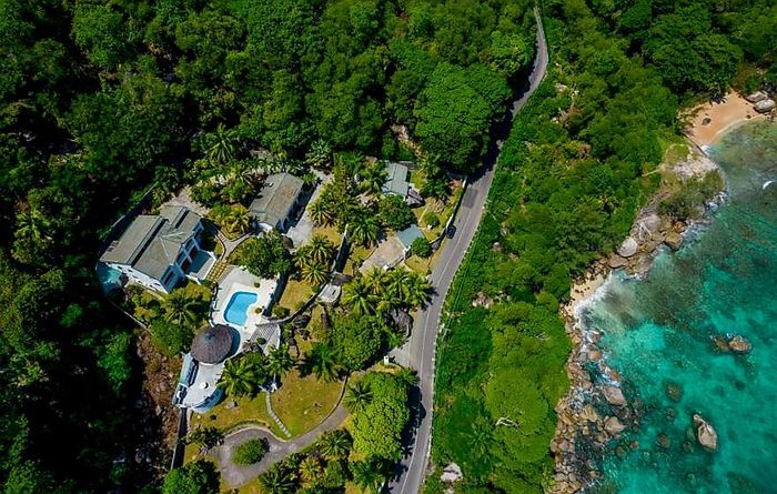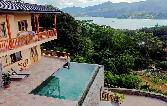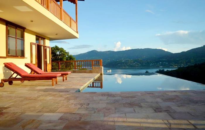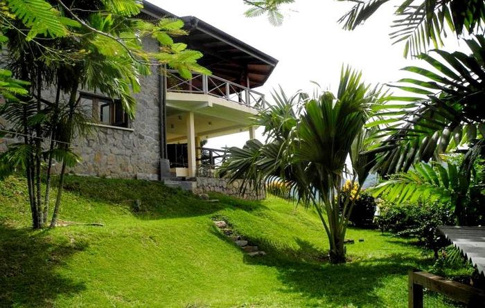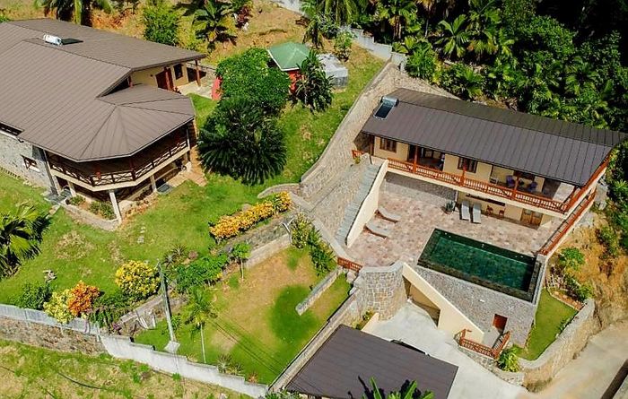 Island living with sweeping sea views in Machabee, North Mahé — a rare, two-level villa on nearly a hectare of lush tropical grounds with large pool, four bedrooms and three baths.