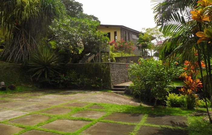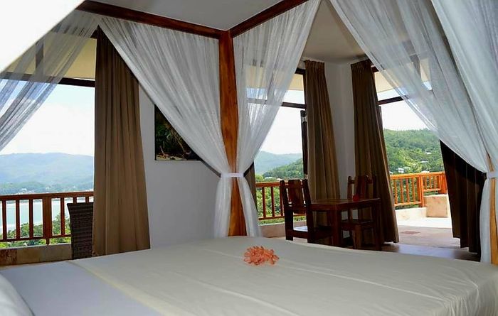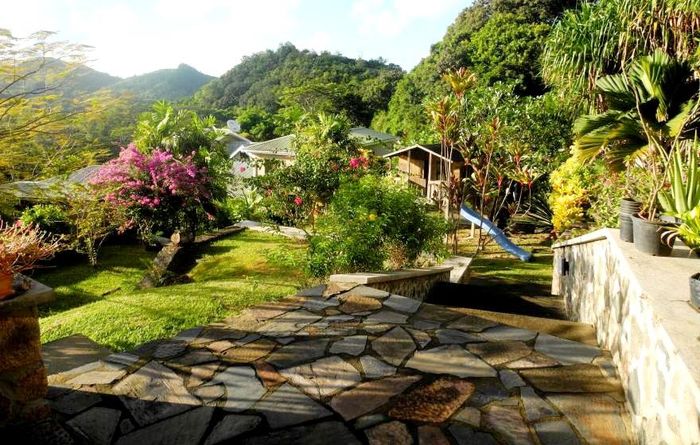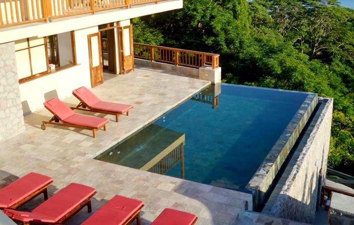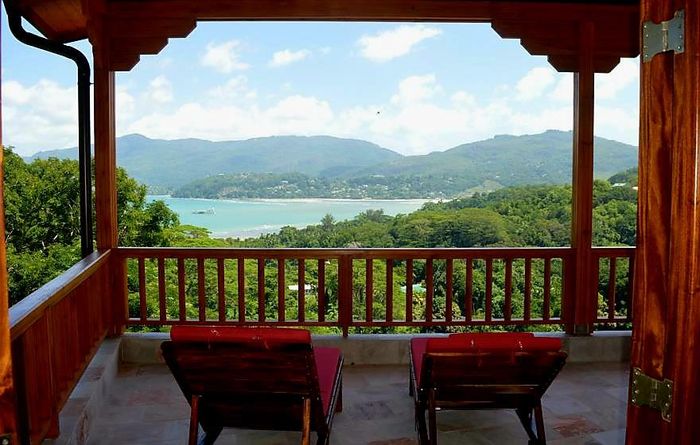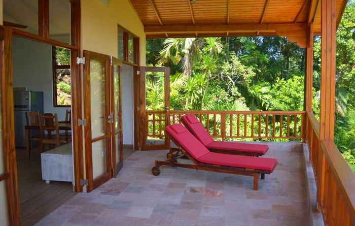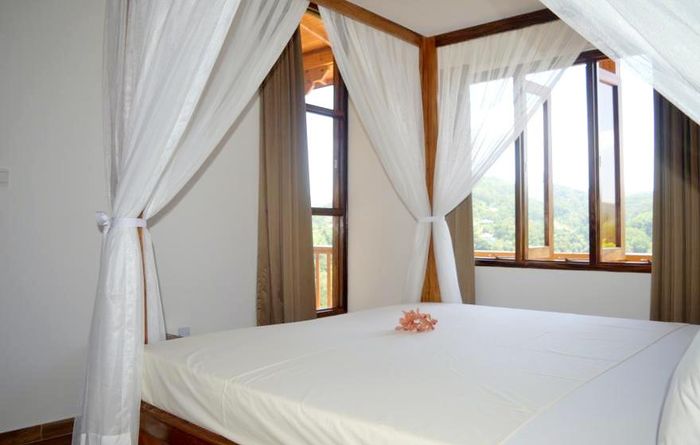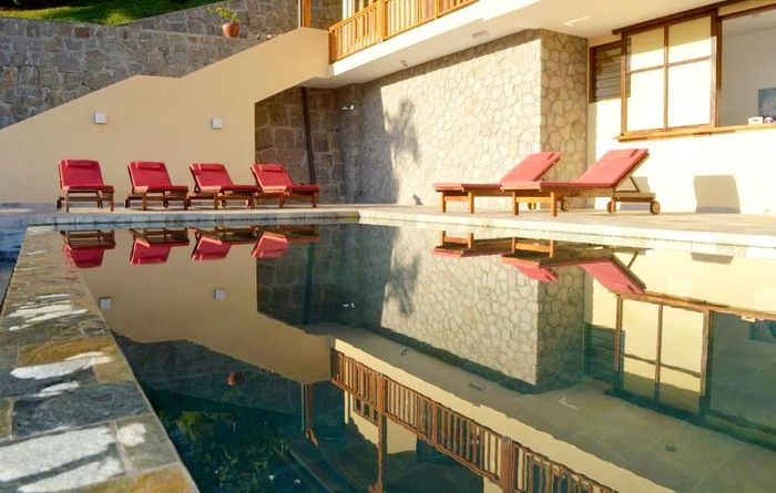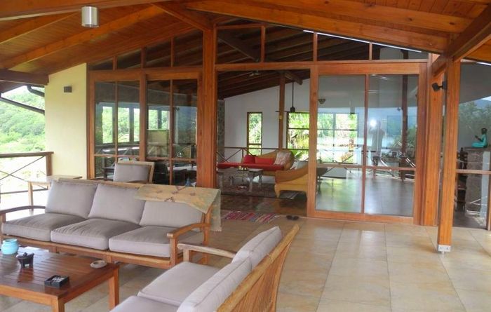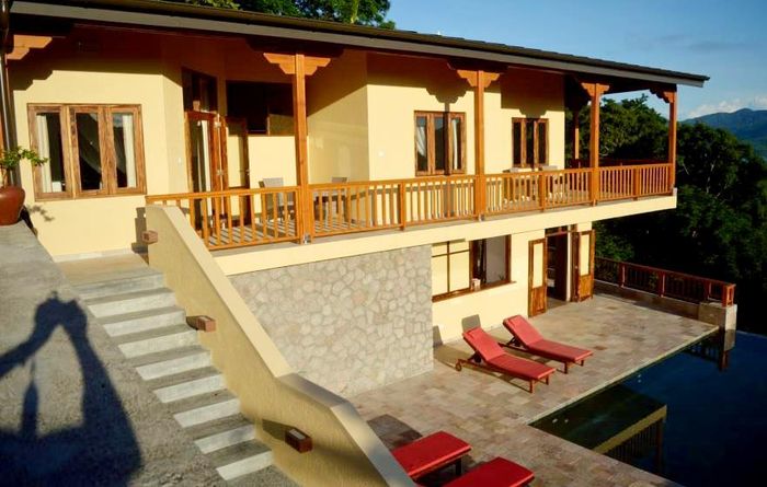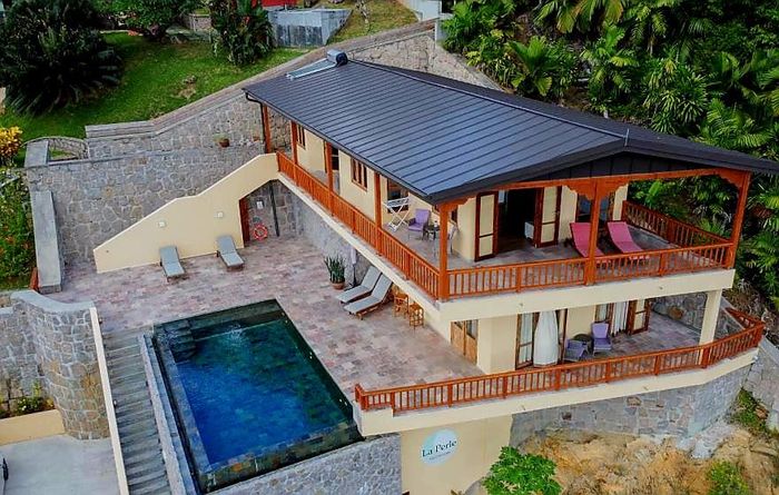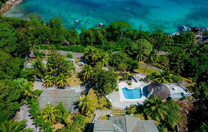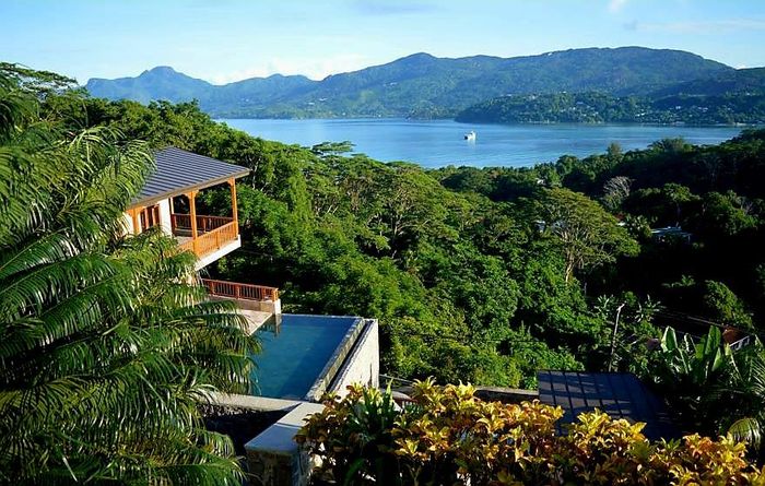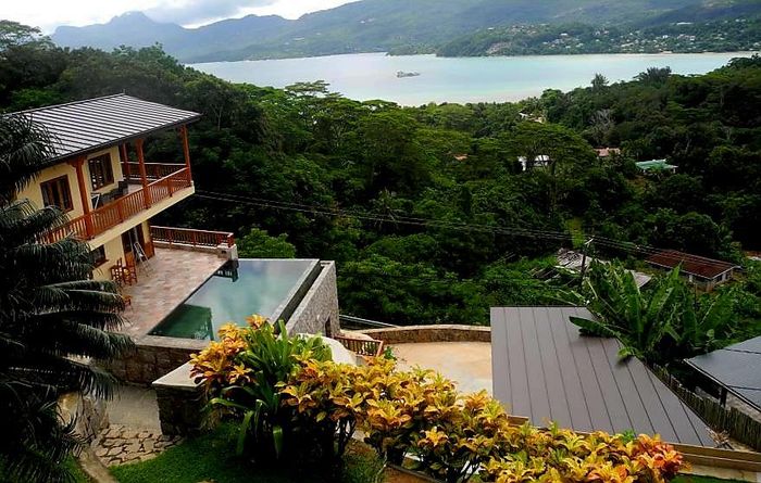 Island living with sweeping sea views in Machabee, North Mahé — a rare, two-level villa on nearly a hectare of lush tropical grounds with large pool, four bedrooms and three baths.