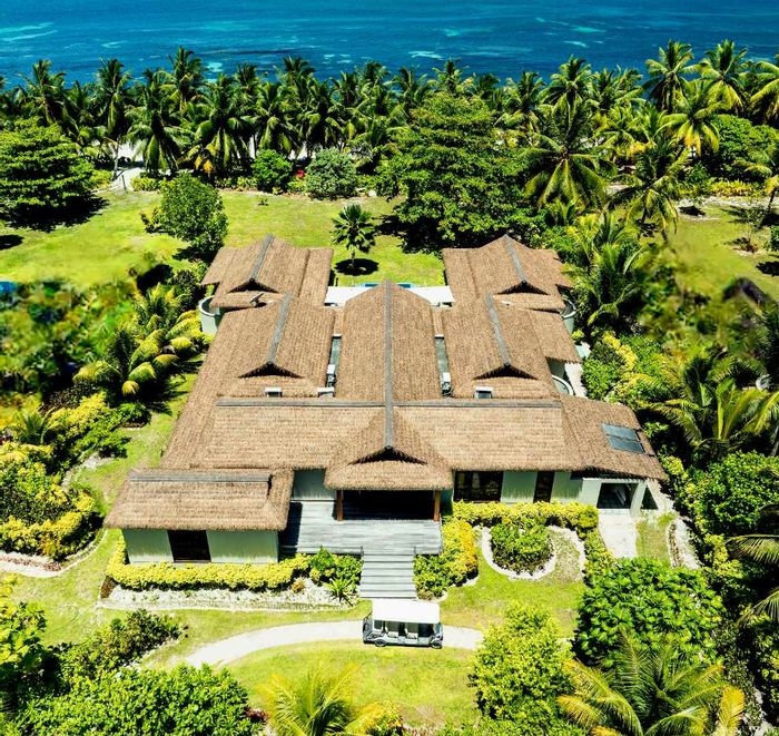 Beachfront villa on Desroches Island with 4 bedrooms, 5 bathrooms, 440 m² living space, and 2500 m² land.
